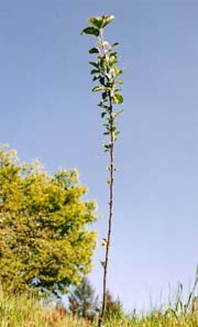 7. Don't become so focused on the fruit that you forget the tree . Healthy fruit grows on healthy trees. Too many people seem obsessed about getting a precocious crop off of their young trees. This can lead to broken or misshapen branches and stunted trees. It is often best to strip off a premature fruit set to allow the tree to develop a strong, well-formed framework that can hold a crop year after year. Getting a young tree established during its adolescent period is crucial to long-term success. Judicious pruning and training means less remedial damage control later on. A properly structured tree will allow optimum air circulation and light penetration; this results in better quality, less blemished fruit. Too much openess, however, can lead to sunburn and borer damage. Again, we do recommend the use of white paint on young trunks when appropriate. Balanced feeding and watering is, of course, essential. The orchardist should carefully monitor shoot growth - both length and caliper - and adjust irrigation and fertilization accordingly. This requires some experience with "normal" growth rates for trees in a particular zone. Here in California, drought stress - and concurrent lack of vigor - can frequently lead to attack from the flatheaded apple borer. On the other hand, excessive watering and fertilizing - whether chemical or organic - can make a tree more susceptible to disease. Fireflight (Erwinia) in particular likes to prey on apple and pear trees that have been "hyped" with too much nitrogen. Go a little slow with the manure teas and fish emulsion - even though they are certified organic .....